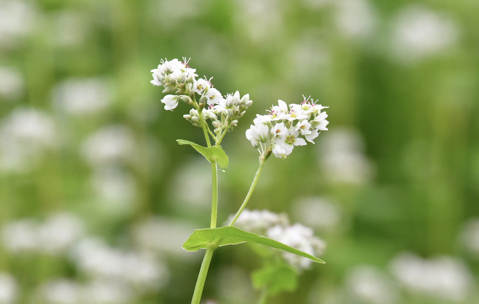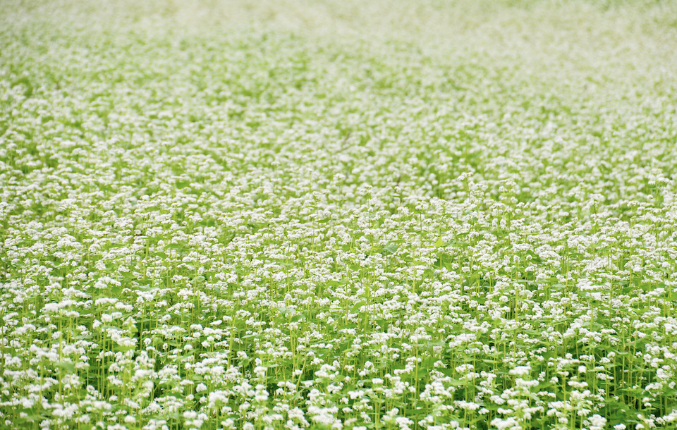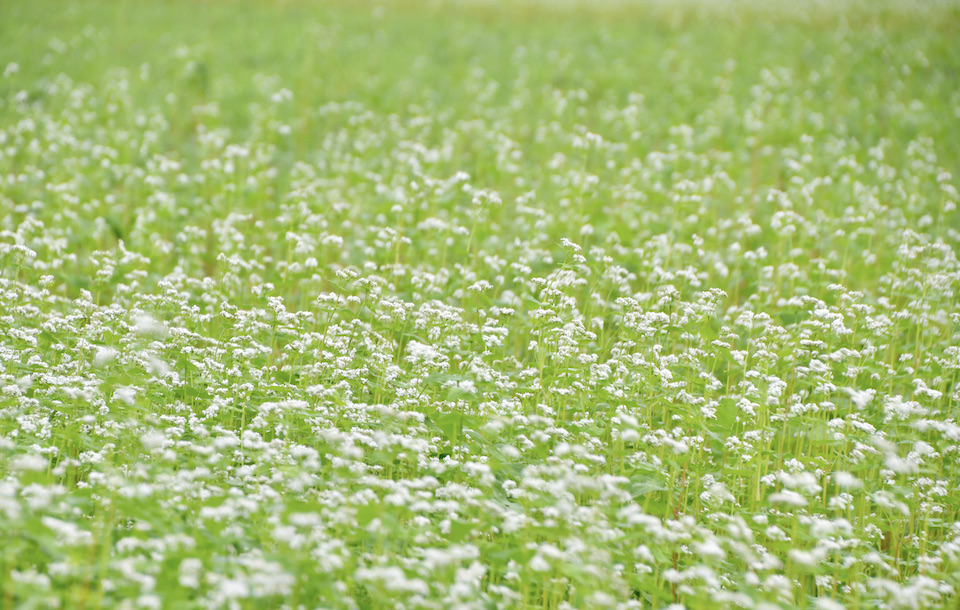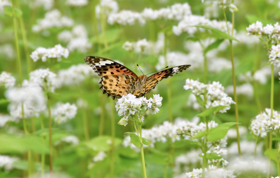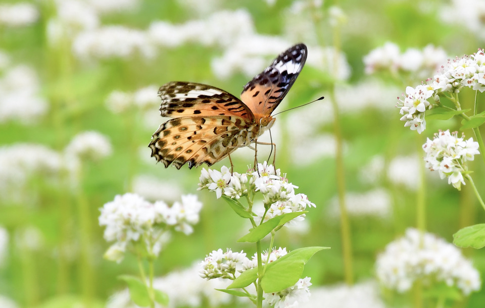 そばの花が見頃を迎え、一面が白い絨毯のようになるとツマグロヒョウモンたちが蜜を求めにやってきます。